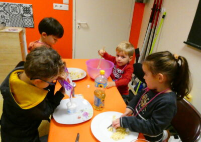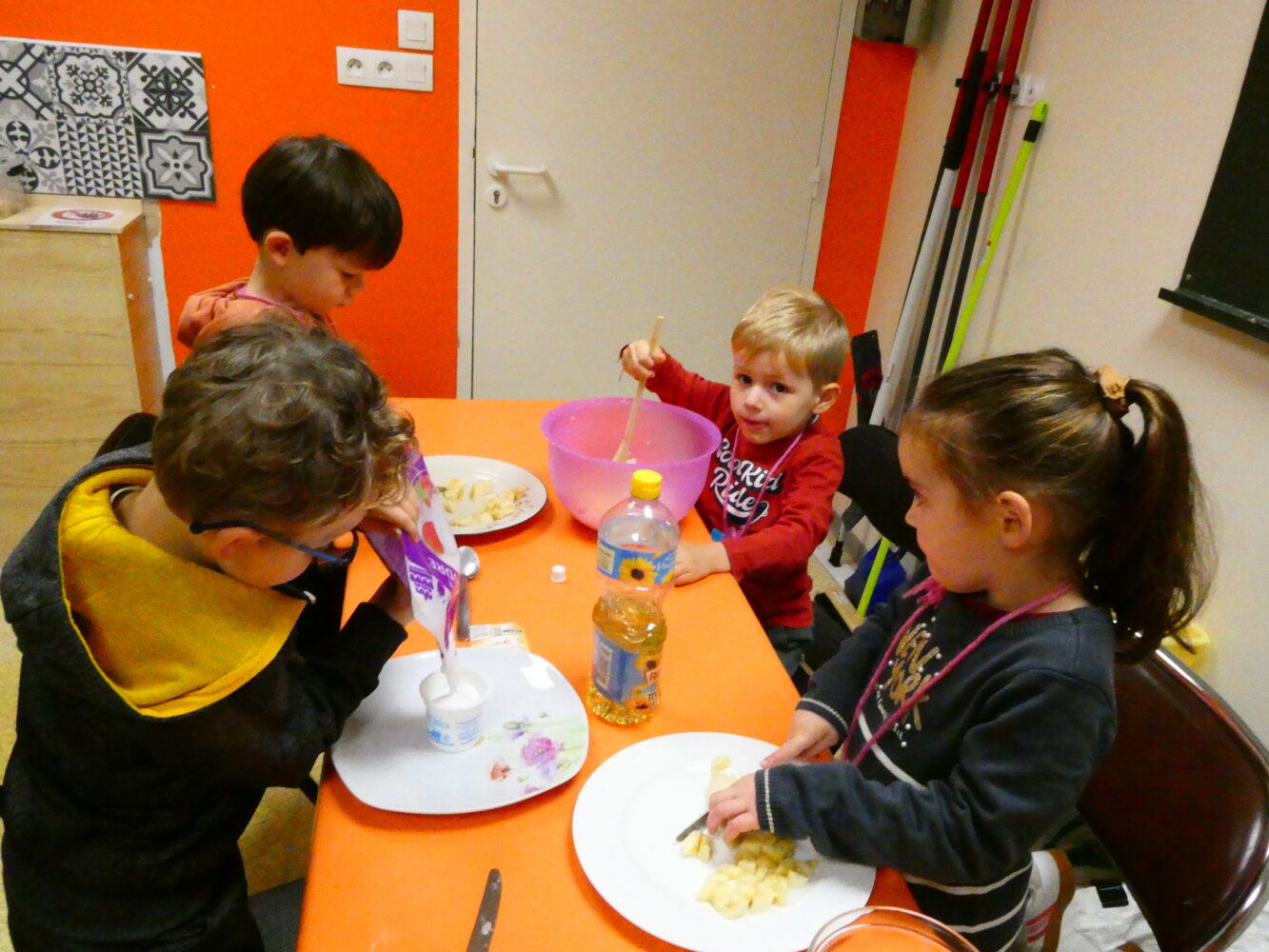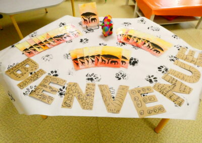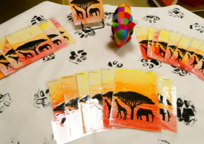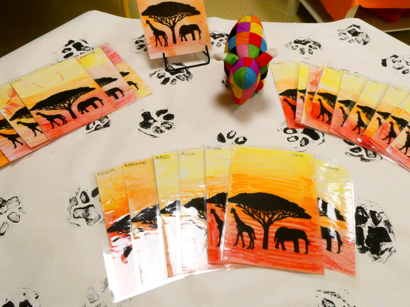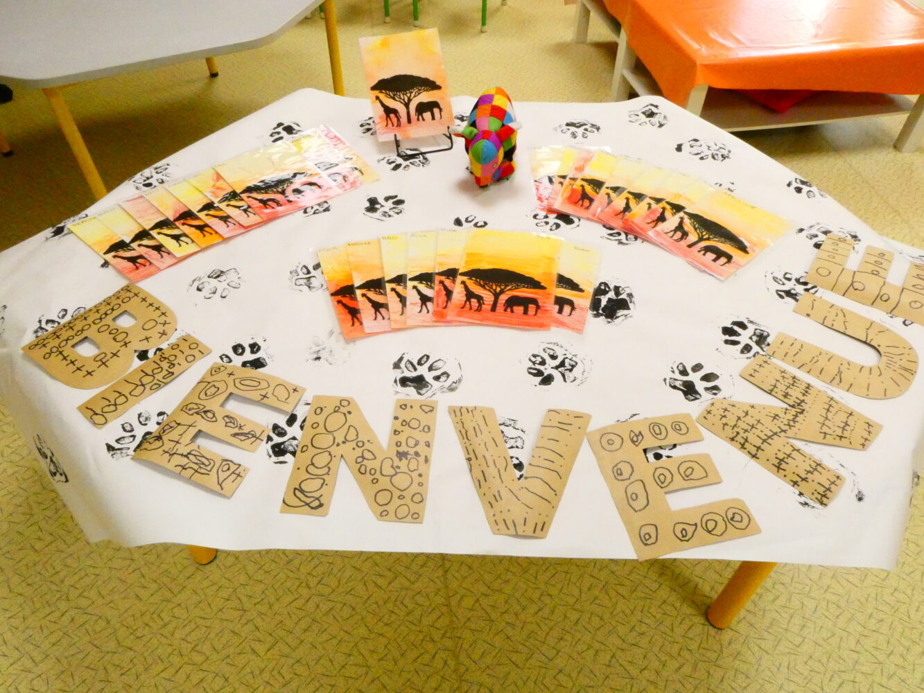 Afin d’accueillir les parents de manière conviviale, nous avons dressé une jolie table d’inspiration africaine: nappe avec empreintes de pattes de lion, carte “coucher de soleil sur la savane” confectionnée pour chacun, et un bon gâteau à la banane.